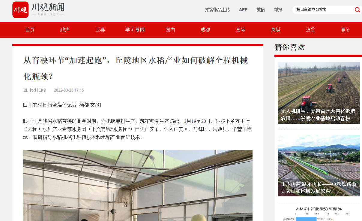 眼下正是我省水稻育秧的黄金时期。为把脉春耕生产,筑牢粮食生产防线,3月19至20日,科技下乡万里行(22团)水稻产业专家服务团(下文简称“服务团”)走进广安市,深入广安区、前锋区、岳池县、华蓥市等地,调研指导水稻机械化种植技术和水稻产业管理技术。
