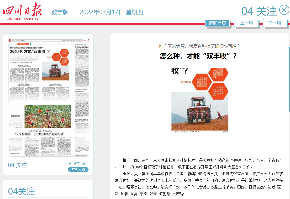 玉米、大豆属于同季旱粮作物,二者间作套种的传统已久,但过去效益不高。推广玉米大豆带状复合种植,关键要能达到“玉米不减产,多收一季豆”的目的。复合种植不是简单地把玉米大豆种在一起,需要良法。怎么种才能实现“双丰收”?记者兵分多路进行采访。□四川日报全媒体记者 燕巧 钟帆 秦勇 宁宁 张蒙 何勤华 王若晔