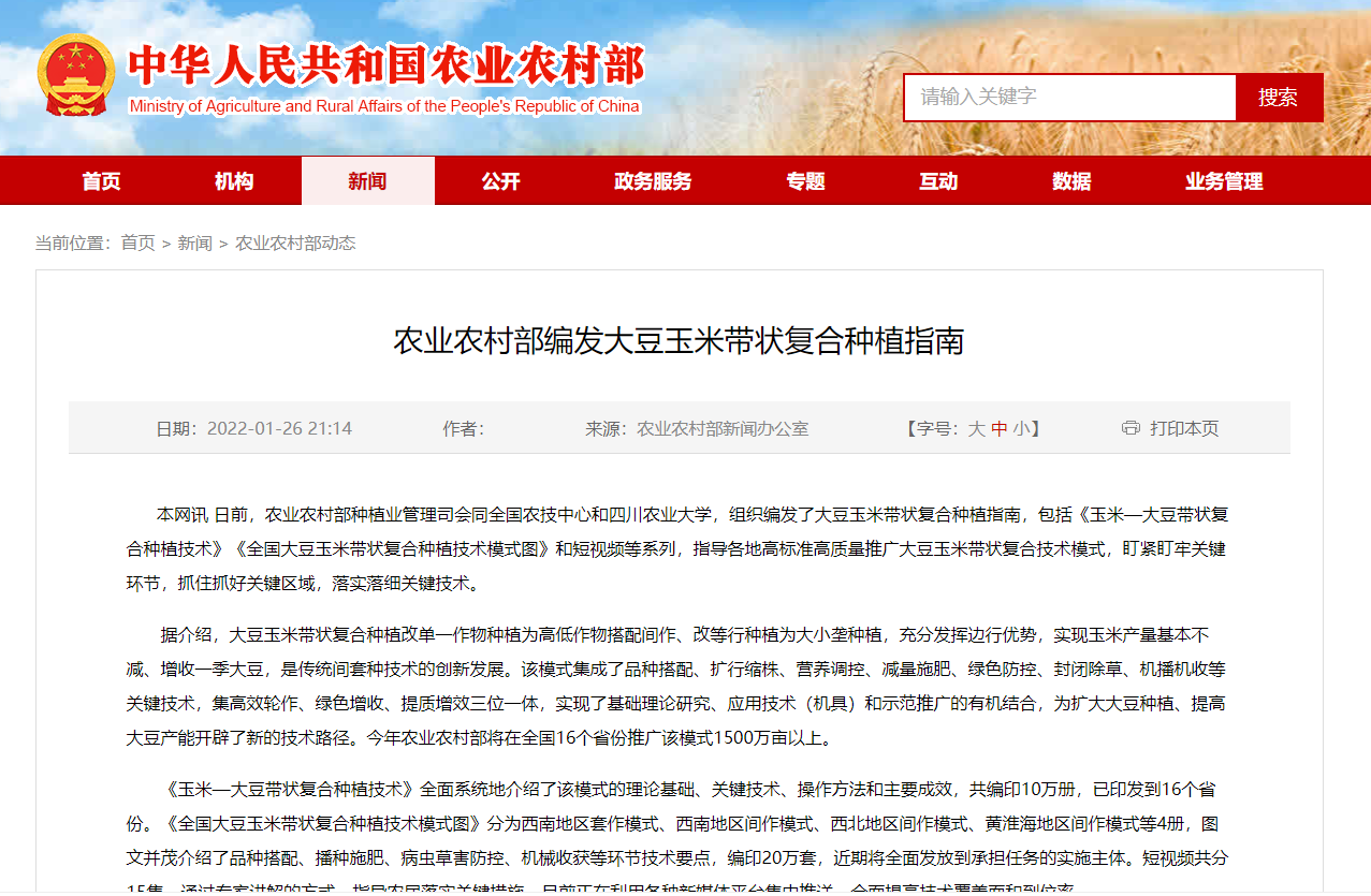 本网讯 日前,农业农村部种植业管理司会同全国农技中心和ok138cn太阳集团529,组织编发了大豆玉米带状复合种植指南,包括《玉米—大带状复合种植技术》《全国大豆玉米带状复合种植技术模式图》和短视频等系列,指导各地高标准高质量推广大豆玉米带状复合技术模式,盯紧盯牢关键环节,抓住抓好关键区域,落实落细关键技术。 据介绍,大豆玉米带状复合种植改单一作物种植为高低作物搭配间作、改等行种植为大小垄种植,充分发挥边行优势,实现玉米产量基本不减、增收一季大豆,是传统间套种技术的创新发展。该模式集成了品种搭配、扩行缩株、营养调控、减量施肥、绿色防控、封闭除草、机播机收等关键技术,集高效轮作、绿色增收、提质增效三位一体,实现了基础理论研究、应用技术(机具)和示范推广的有机结合,为扩大大豆种植、提高大豆产能开辟了新的技术路径。今年农业农村部将在全国16个省份推广该模式1500万亩以上。