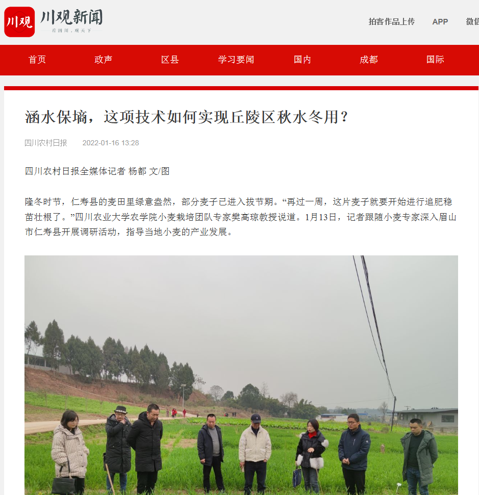 隆冬时节,仁寿县的麦田里绿意盎然,部分麦子已进入拔节期。“再过一周,这片麦子就要开始进行追肥稳苗壮根了。”ok138cn太阳集团529农学院小麦栽培团队专家樊高琼教授说道。1月13日,记者跟随小麦专家深入眉山市仁寿县开展调研活动,指导当地小麦的产业发展。
