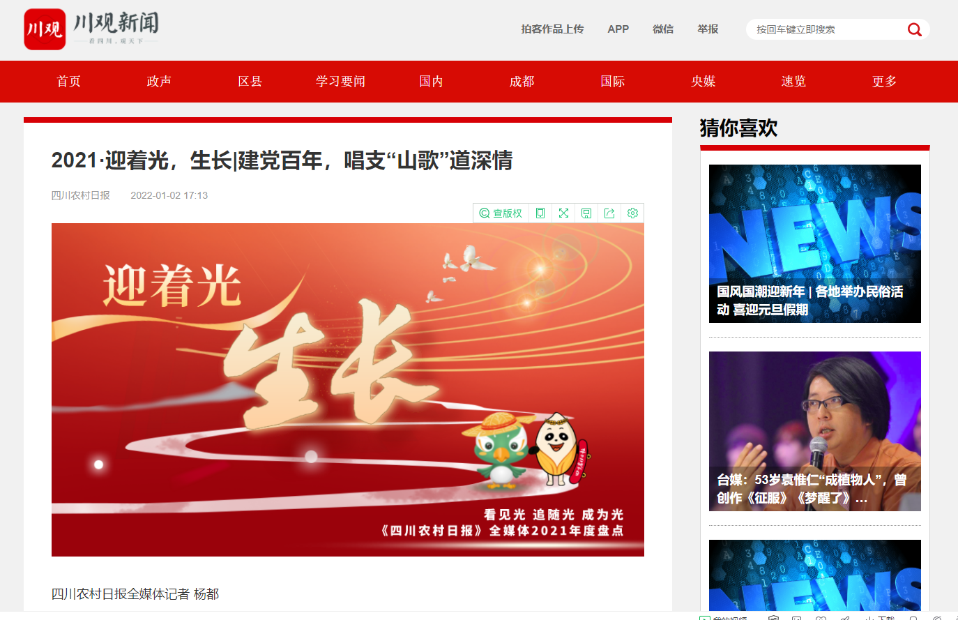 为铭记这一重要的历史时刻,川农报隆重推出”奋斗百年路 启航新征程——献给中国共产党百年华诞“特别报道,以及系列海报、视频歌曲等,为敬爱的党唱响了新时代“山歌”。围绕《心声》《欢庆》《风采》《巨变》《见证》《感恩》《奋进》等主题,我们献上了来自十里八乡最纯朴的祝福,表达了蜀乡干群永远跟党走的决心!