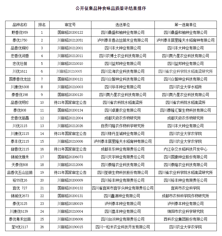 11月23日,省农业农村厅发布推荐参加2021年国家优质稻品种食味品质鉴评遴选品种的公示名单,拟推荐食味评分排名前三位的野香优959、泰优1750、品香优秱珍三个品种参加2021年国家优质稻品种食味品质鉴评。