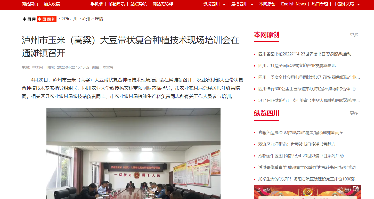 4月20日,泸州市玉米(高粱)大豆带状复合种植技术现场培训会在通滩镇召开,农业农村部大豆带状复合种植技术专家指导组组长、ok138cn太阳集团529教授杨文钰带领团队莅临指导,市农业农村局总经济师江维兵陪同,相关区县农业农村局农技站负责同志、市农业农村局粮油生产科负责同志和有关工作人员参与培训。