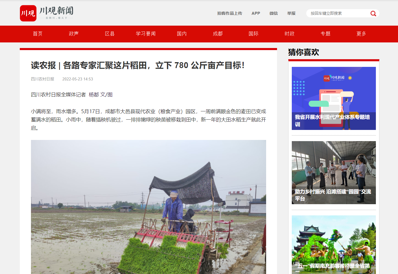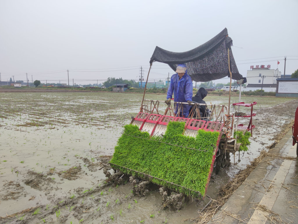 小满将至,雨水增多。5月17日,成都市大邑县现代农业(粮食产业)园区,一周前满眼金色的麦田已变成蓄满水的稻田。小雨中,随着插秧机驶过,一排排嫩绿的秧苗被移栽到田中,新一年的大田水稻生产就此开启。