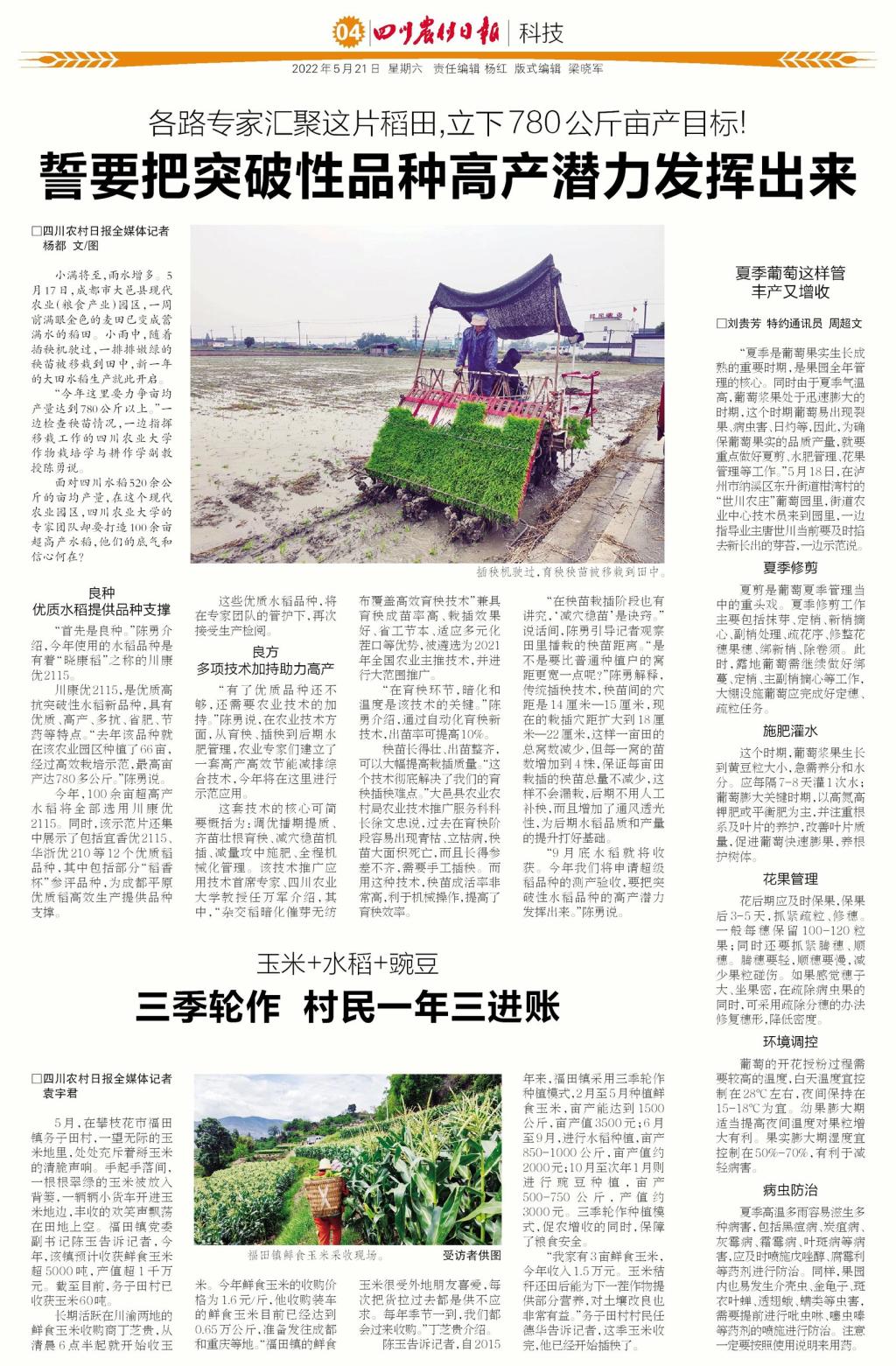 “有了优质品种还不够,还需要农业技术的加持。”陈勇说,在农业技术方面,从育秧、插秧到后期水肥管理,农业专家们建立了一套高产高效节能减排综合技术,今年将在这里进行示范应用。