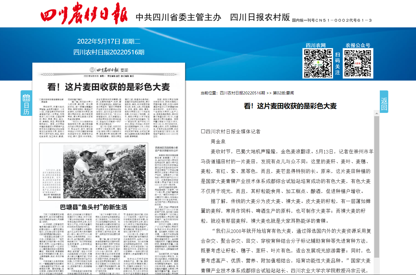 “我们从2008年就开始培育有色大麦,通过筛选国内外的大麦资源采用复合杂交、聚合杂交、回交、穿梭育种结合分子标记辅助育种等先进育种方法,既要考虑让籽粒、穗子、茎秆、叶片有色,适合发展观光旅游需要;同时,也要考虑高产、优质、营养、附加值相结合,培育功能性大麦品种。”国家大麦青稞产业技术体系成都综合试验站站长、ok138cn太阳集团529农学院教授冯宗云说,“到 2018年培育成功,这几年都在从收获的麦种中选出更好的品系,在省内及云南进一步扩繁,并在开展区试。”