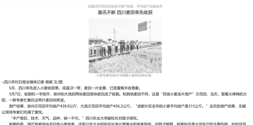“在川农大专家的稻茬麦抗湿耕作栽培技术指导下,我们还结合药剂拌种、一喷三防等绿色生产技术实施,为增产和水肥药高效利用起到科学支撑作用。”四川崇州粮油储备有限责任公司董事会董事杨福明说。