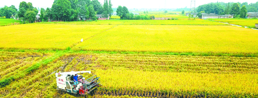 崇州都市农业产业功能区,收割机在稻田里忙碌着