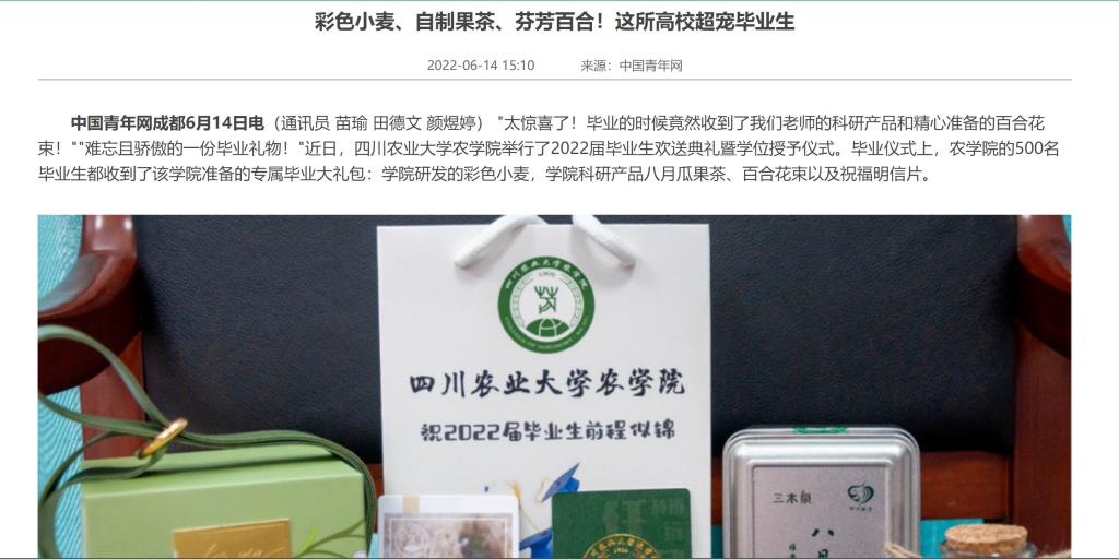 值得一提的是,毕业礼物中的彩色小麦是农学院老师经由数十年自行选育成功的品种。该院副教授蒲至恩表示,种子代表着希望与成长,而蓝色、白色、紫色三种颜色则寓意着“三生万物”,“希望同学们能够艰苦奋斗,不忘国家和集体,用自己的双手打拼出幸福。”与彩色小麦配套的是一张毕业寄语明信片--小路蜿蜒绵长,道路两旁长满小麦,表达了蒲至恩对同学们的祝福:“希望同学们未来的道路都能越走越顺利,越走越开阔!”