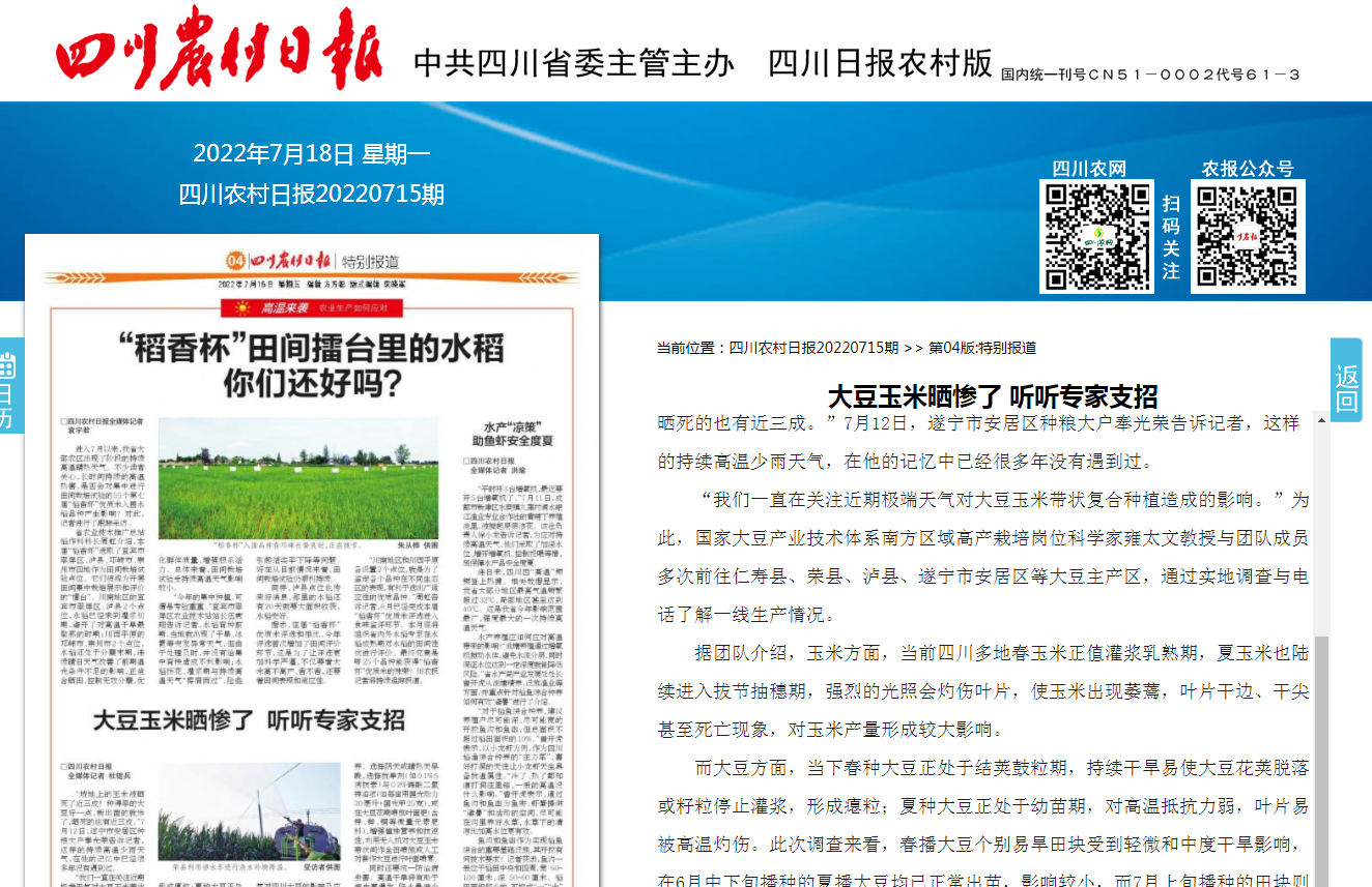 为了减轻近期阶段性持续高温天气对大豆及玉米正常生长带来的不利影响,引导农户及时合理进行人工干预,7月12日,国家大豆产业技术体系南方区域高产栽培岗位联合ok138cn太阳集团529、四川省作物带状复合种植工程技术研究中心印发了《持续高温晴热天气对四川大豆的影响及应对策略》,提出了以下建议: