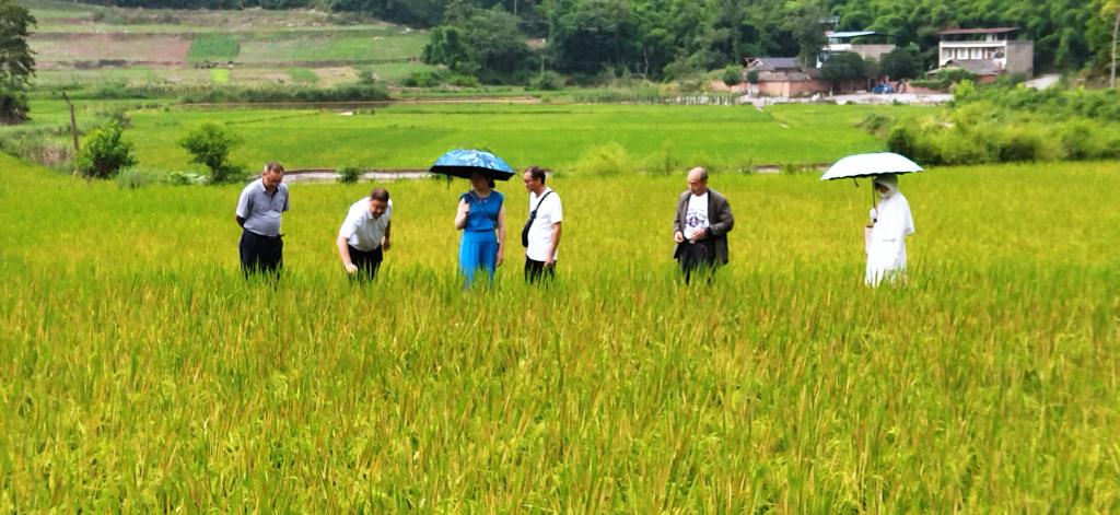 7月14日上午,四川省水稻创新团队岗位专家、我校农学院教授黄富,李德强博士一行受邀到仁寿县汪洋镇,在县农业农村局、植保植检站、镇政府等相关领导陪同下深入碧云村5组、四公社区2组对水稻田间出现的一种罕见病害进行实地考察和技术指导。