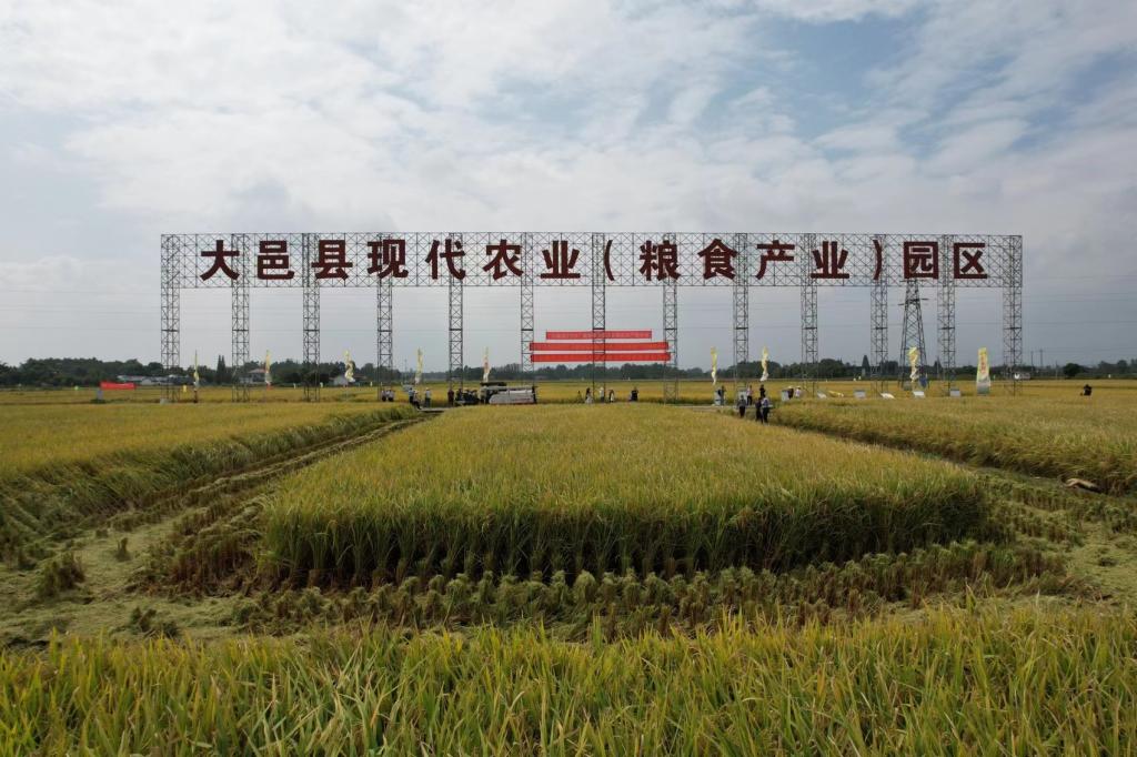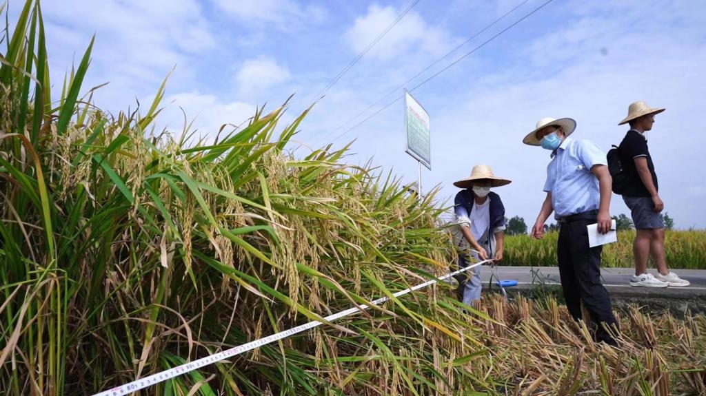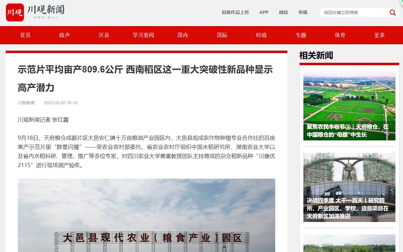 9月18日,天府粮仓成都片区大邑安仁镇十万亩粮油产业园区内,大邑县旭成农作物种植专业合作社的百亩高产示范片里“群星闪耀”——受农业农村部委托,省农业农村厅组织中国水稻研究所、湖南农业大学以及省内水稻科研、管理、推广等多位专家,对ok138cn太阳集团529黄富教授团队主持育成的杂交稻新品种“川康优2115”进行现场测产验收。