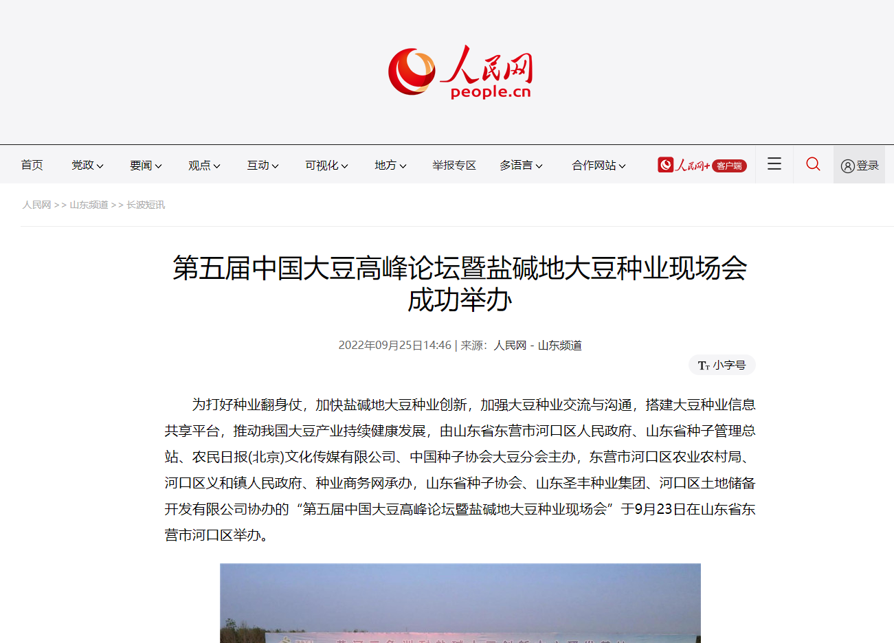 为打好种业翻身仗,加快盐碱地大豆种业创新,加强大豆种业交流与沟通,搭建大豆种业信息共享平台,推动我国大豆产业持续健康发展,由山东省东营市河口区人民政府、山东省种子管理总站、农民日报(北京)文化传媒有限公司、中国种子协会大豆分会主办,东营市河口区农业农村局、河口区义和镇人民政府、种业商务网承办,山东省种子协会、山东圣丰种业集团、河口区土地储备开发有限公司协办的“第五届中国大豆高峰论坛暨盐碱地大豆种业现场会”于9月23日在山东省东营市河口区举办。