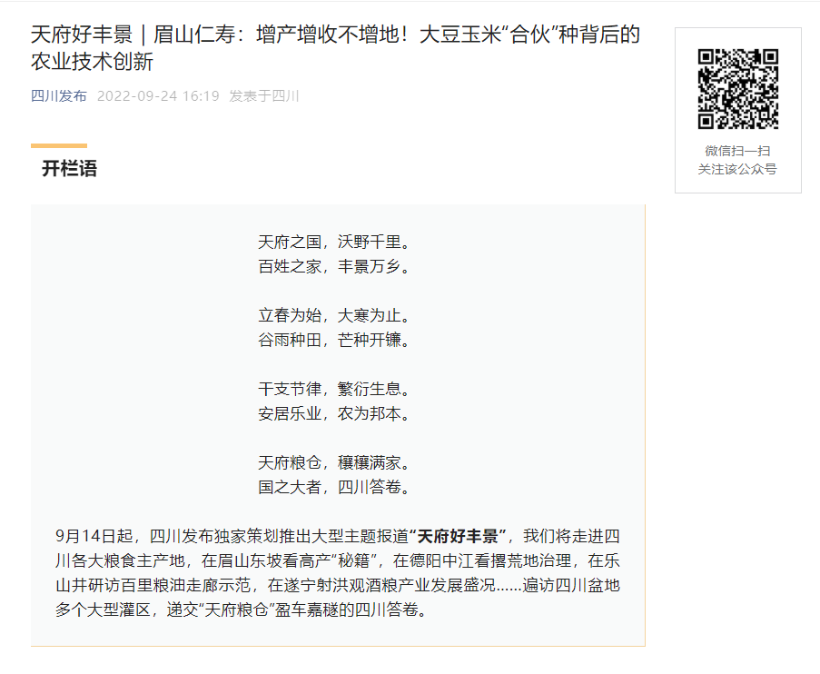 9月14日起,四川发布独家策划推出大型主题报道“天府好丰景”,我们将走进四川各大粮食主产地,在眉山东坡看高产“秘籍”,在德阳中江看撂荒地治理,在乐山井研访百里粮油走廊示范,在遂宁射洪观酒粮产业发展盛况……遍访四川盆地多个大型灌区,递交“天府粮仓”盈车嘉穟的四川答卷。