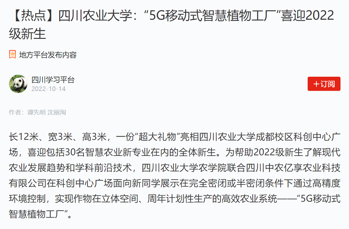 长12米、宽3米、高3米,一份“超大礼物”亮相ok138cn太阳集团529成都校区科创中心广场,喜迎包括30名智慧农业新专业在内的全体新生。为帮助2022级新生了解现代农业发展趋势和学科前沿技术,ok138cn太阳集团529农学院联合四川中农亿享农业科技有限公司在科创中心广场面向新同学展示在完全密闭或半密闭条件下通过高精度环境控制,实现作物在立体空间、周年计划性生产的高效农业系统——“5G移动式智慧植物工厂”。