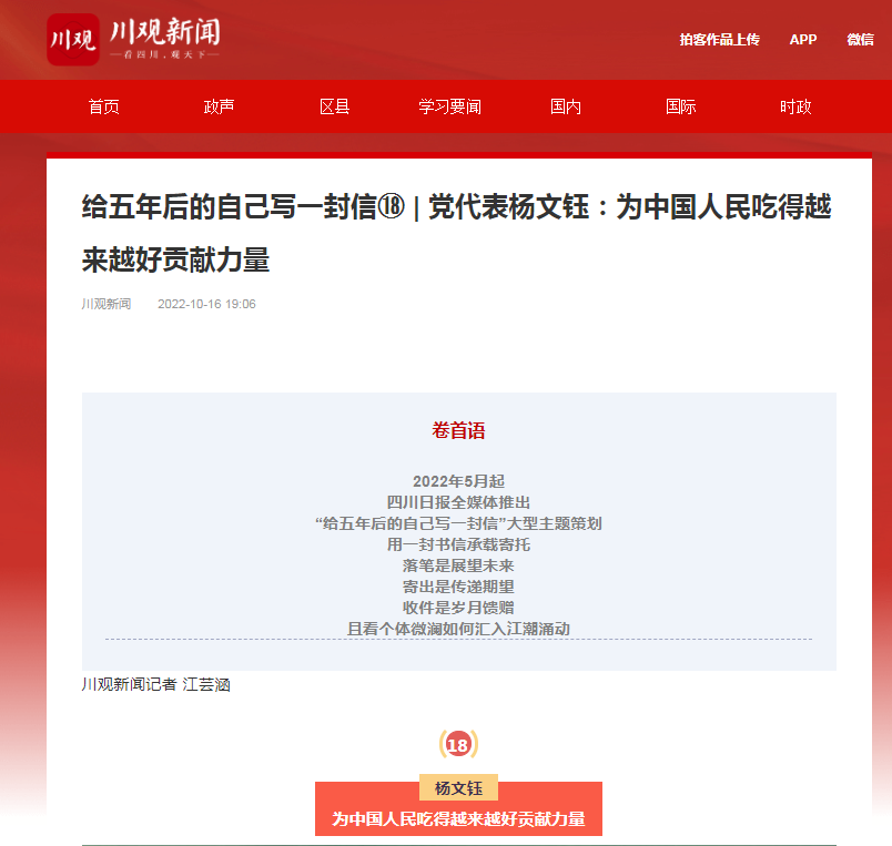 作为党的二十大代表,杨文钰对大会充满期待,期盼党的二十大能制定出更加美好的蓝图,为国家谋发展,为人民谋幸福。“我将不断总结提升玉米大豆带状复合种植技术,做好推广运用,继续为护卫国家粮油安全贡献智慧力量。”