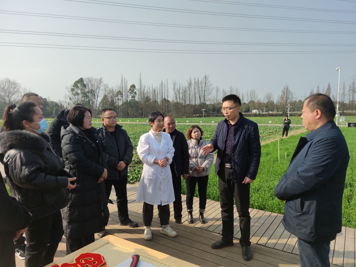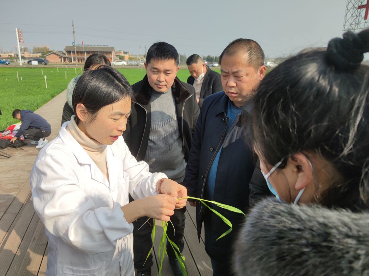 崇州市小麦田间,樊高琼(左一)在向种粮户讲解小麦生物进程。
