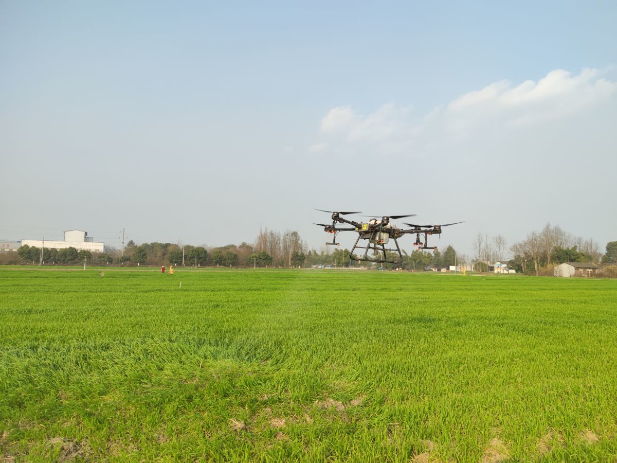 无人机对小麦进行壮苗防冻作业。