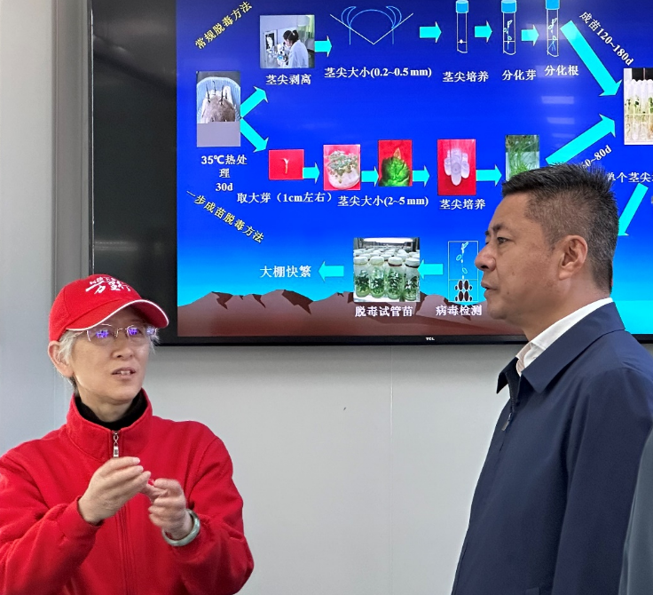 我校薯类团队王西瑶教授及入驻基地研究生们向虞平汇报了基地建设及科技支撑布拖县马铃薯产业发展工作成效。目前,我校师生已有80余名专家、博士、硕士研究生先后入驻布拖县开展科技服务4年,薯类团队根据布拖县马铃薯品种退化、种植技术落后、技术推广艰难等生产问题,构建了以种薯活力调控为核心的“良种、良法、良繁、良品、良模”产业联动新模式,帮助当地聚焦打造集育种、生产、加工、销售于一体的马铃薯全产业链。为布拖特色优势马铃薯产业发展注入了科技之力,实现马铃薯产业振兴。