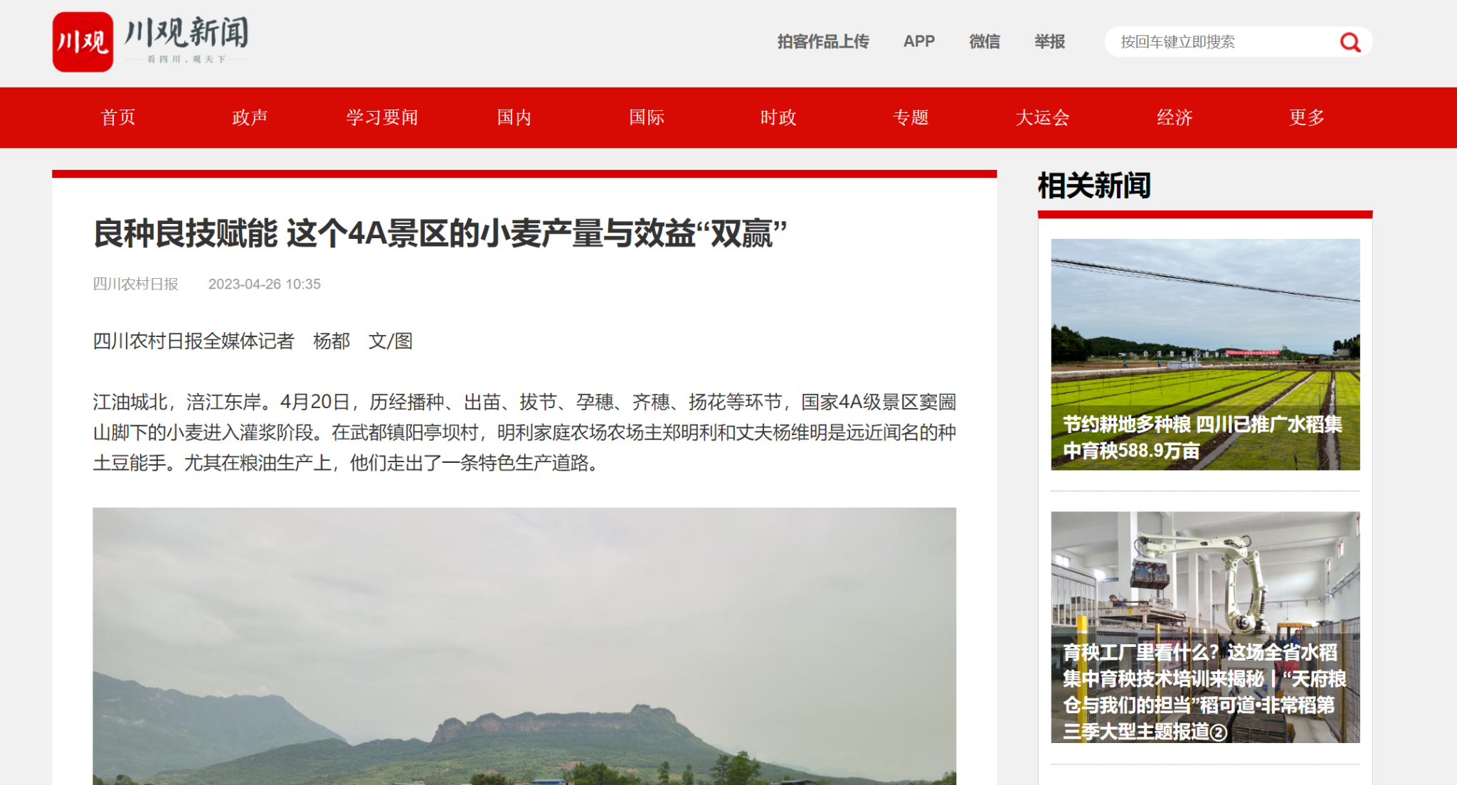 江油城北,涪江东岸。4月20日,历经播种、出苗、拔节、孕穗、齐穗、扬花等环节,国家4A级景区窦圌山脚下的小麦进入灌浆阶段。在武都镇阳亭坝村,明利家庭农场农场主郑明利和丈夫杨维明是远近闻名的种土豆能手。尤其在粮油生产上,他们走出了一条特色生产道路。