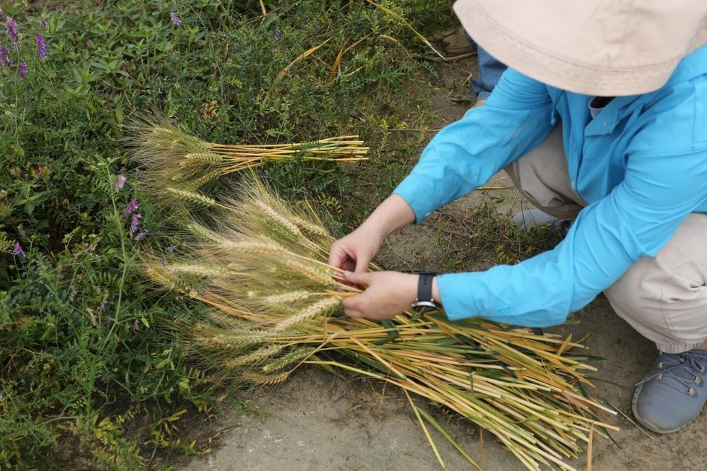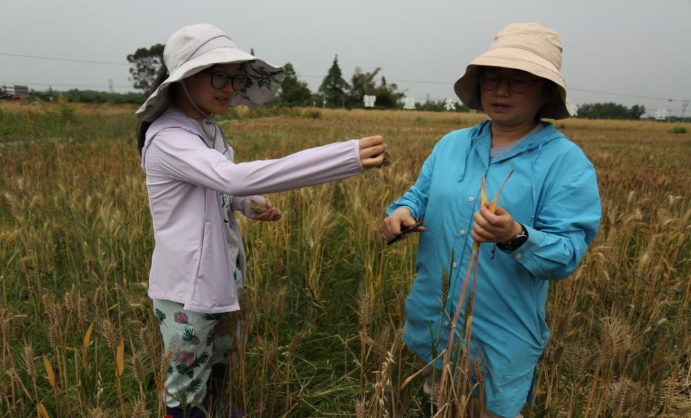 蒲至恩及其科研助理进行小麦选种。