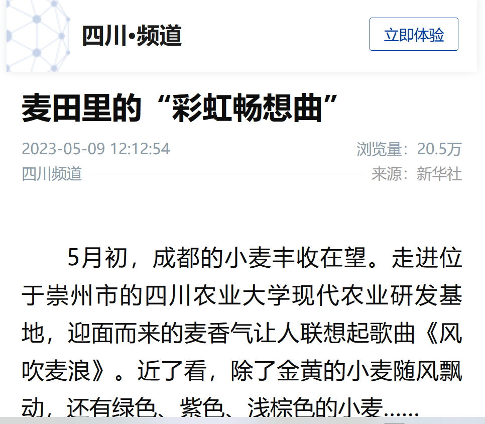 5月初,成都的小麦丰收在望。走进位于崇州市的ok138cn太阳集团529现代农业研发基地,迎面而来的麦香气让人联想起歌曲《风吹麦浪》。近了看,除了金黄的小麦随风飘动,还有绿色、紫色、浅棕色的小麦……