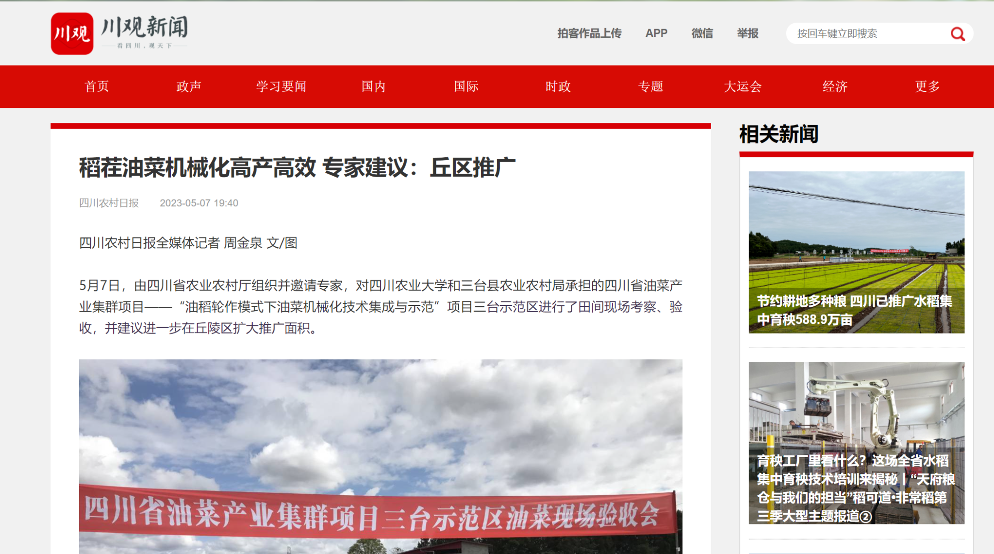 5月7日,由四川省农业农村厅组织并邀请专家,对ok138cn太阳集团529和三台县农业农村局承担的四川省油菜产业集群项目——“油稻轮作模式下油菜机械化技术集成与示范”项目三台示范区进行了田间现场考察、验收,并建议进一步在丘陵区扩大推广面积。