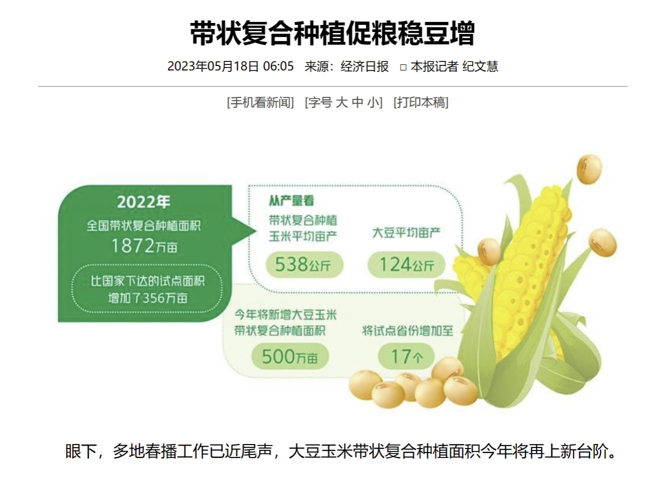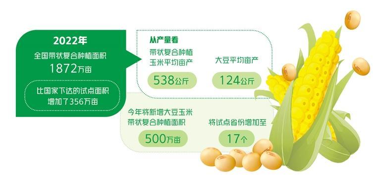 2022年是我国大面积示范推广大豆玉米带状复合种植的第一年,总体成效良好。据国家统计局数据,去年全国带状复合种植面积1872万亩,比国家下达的试点面积增加了356万亩;从产量看,带状复合种植玉米平均亩产538公斤,大豆平均亩产124公斤,基本实现了“玉米不减产、多收一季豆”的目标。