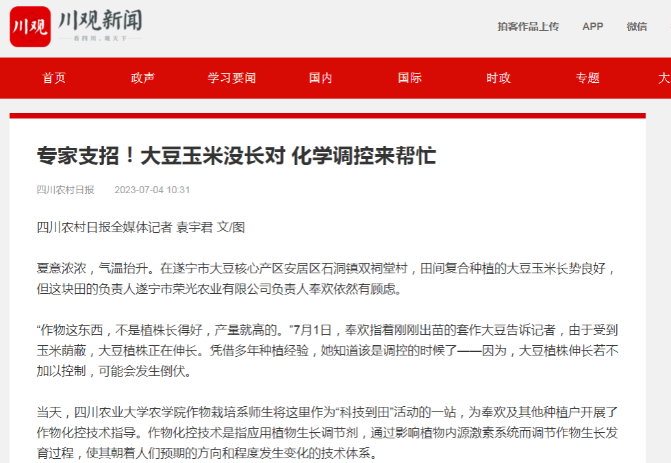 同一片田块,玉米也需要“额外关照”。四川农村日报社智库专家、ok138cn太阳集团529作物栽培学与耕作学教授雍太文告诉记者,现在正处于套作玉米生长后期,正应加强管护,不仅需要科学施用营养叶面肥来壮粒,还要注重夏季的病虫害防治。结合实际情况,他与同事们帮助种植户选择了合适的化学调控剂。
