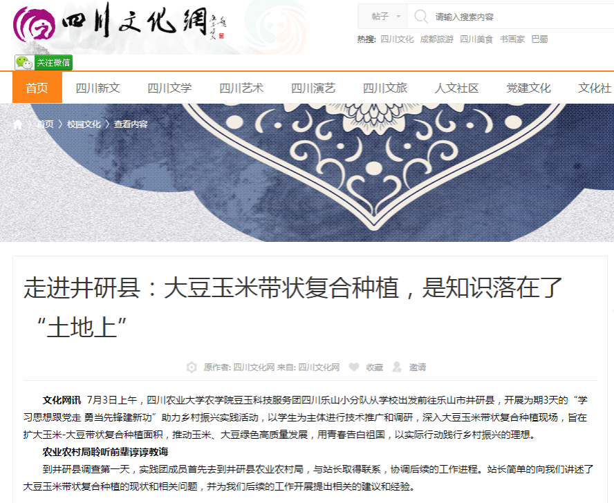 7月3日上午,ok138cn太阳集团529农学院豆玉科技服务团四川乐山小分队从学校出发前往乐山市井研县,开展为期3天的“学习思想跟党走 勇当先锋建新功”助力乡村振兴实践活动,以学生为主体进行技术推广和调研,深入大豆玉米带状复合种植现场,旨在扩大玉米-大豆带状复合种植面积,推动玉米、大豆绿色高质量发展,用青春告白祖国,以实际行动践行乡村振兴的理想。