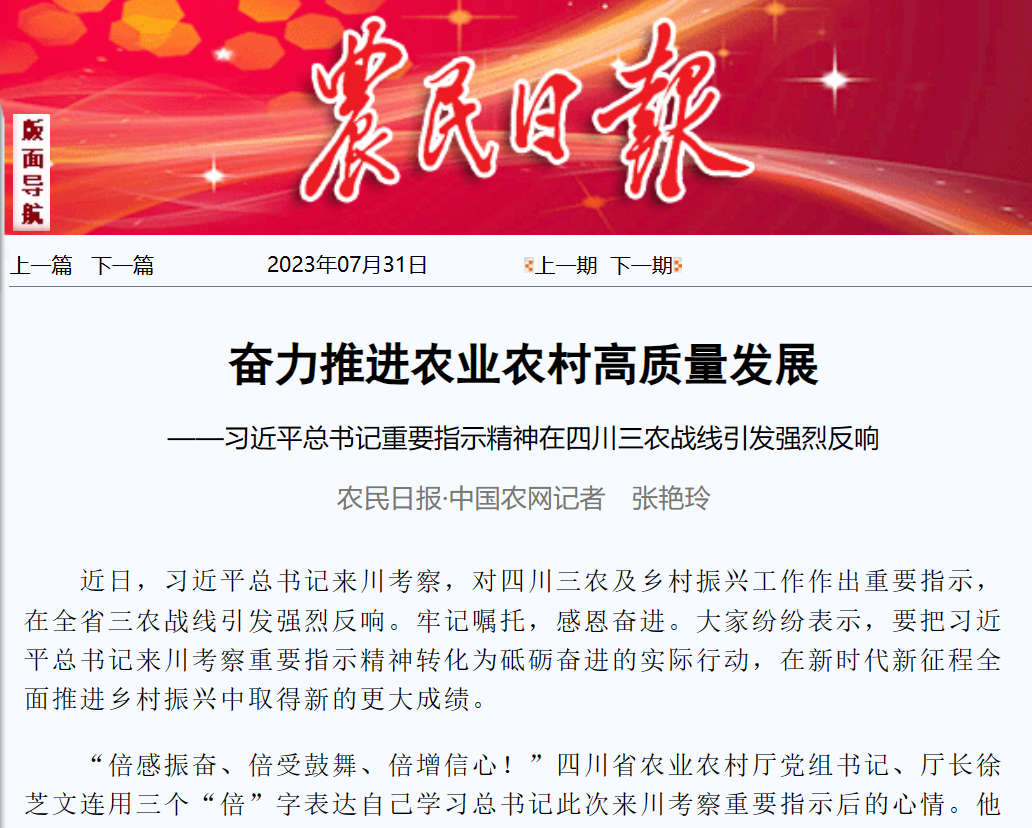 “倍感振奋、倍受鼓舞、倍增信心!”四川省农业农村厅党组书记、厅长徐芝文连用三个“倍”字表达自己学习总书记此次来川考察重要指示后的心情。他说,四川是全国13个粮食主产区之一,有“粮猪安天下”的美誉。作为全国战略大后方,理应为保障国家粮食安全作出贡献。我们将坚定贯彻总书记重要指示,聚焦推进乡村振兴,全面发力,锻长板、补短板,攻重点、求突破,全力推进农业农村高质量发展。要以良田粮用为根本,全力夯实“天府粮仓”根基;以主体培育为重点,加快构建现代农业生产经营体系;以园区集群为载体,强力推动农业产业全链条升级;以示范创建为抓手,全面推进宜居宜业和美乡村建设;以改革试点为引领,积极构建城乡融合发展体制机制。