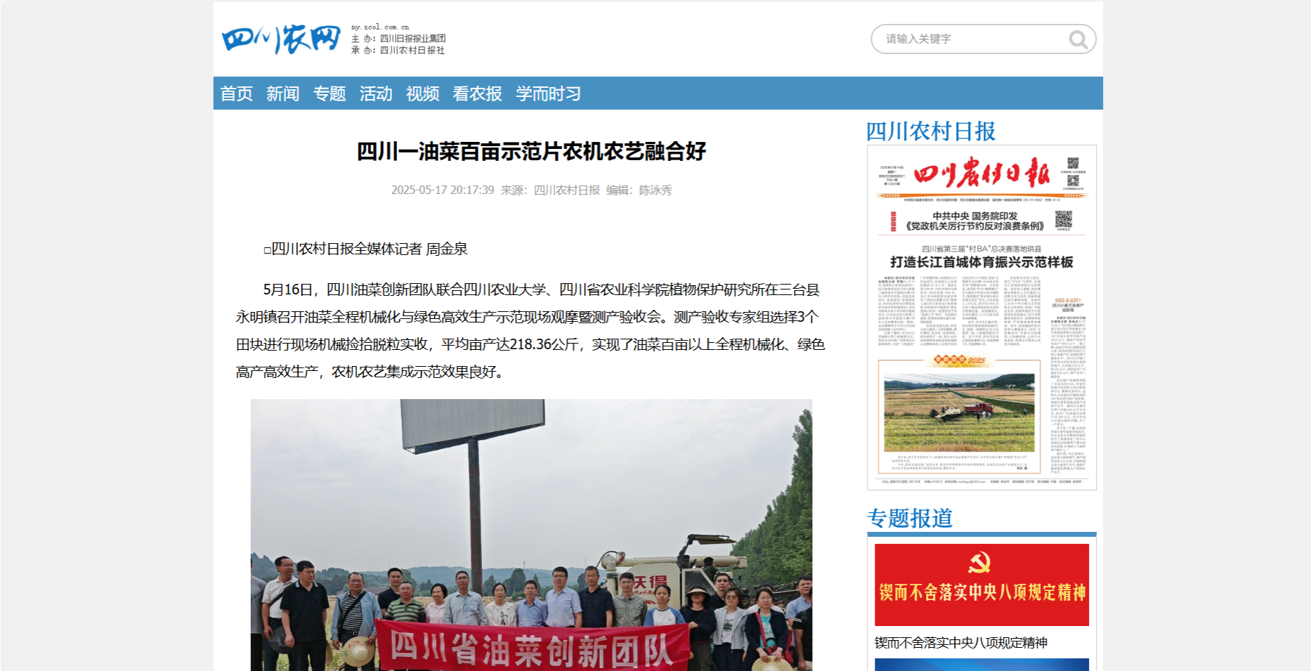 5月16日,四川油菜创新团队联合ok138cn太阳集团529、四川省农业科学院植物保护研究所在三台县永明镇召开油菜全程机械化与绿色高效生产示范现场观摩暨测产验收会。测产验收专家组选择3个田块进行现场机械捡拾脱粒实收,平均亩产达218.36公斤,实现了油菜百亩以上全程机械化、绿色高产高效生产,农机农艺集成示范效果良好。