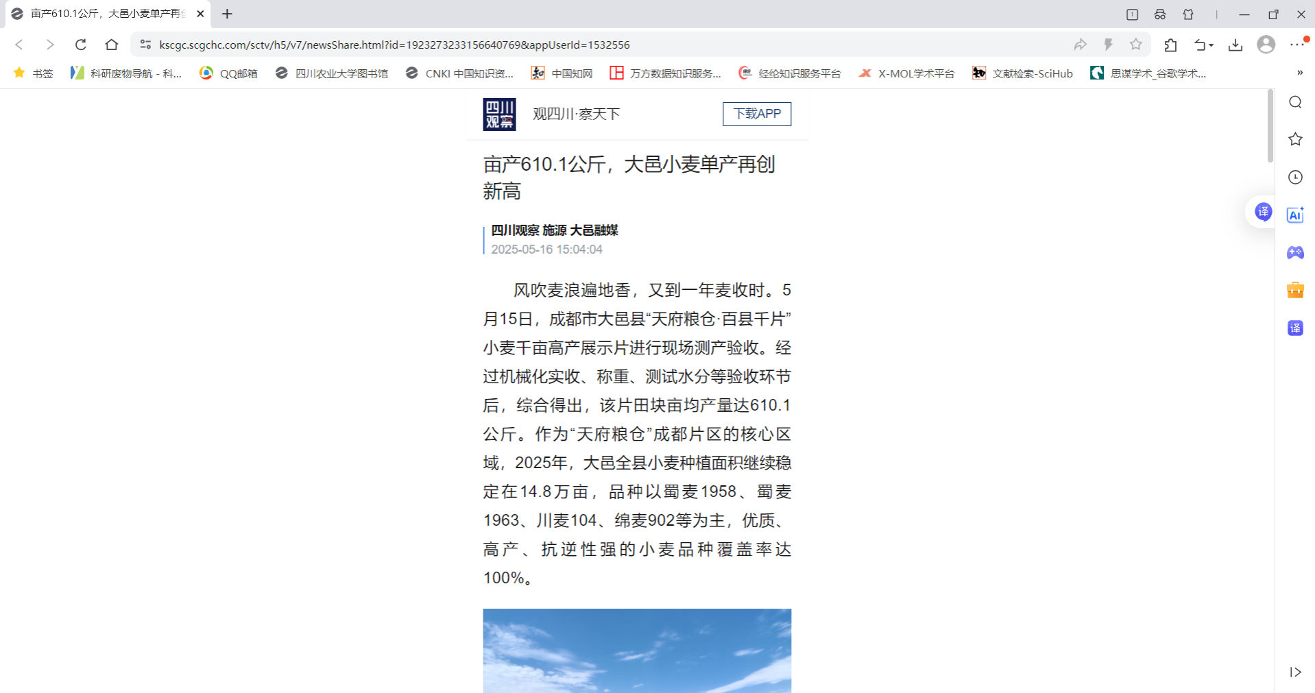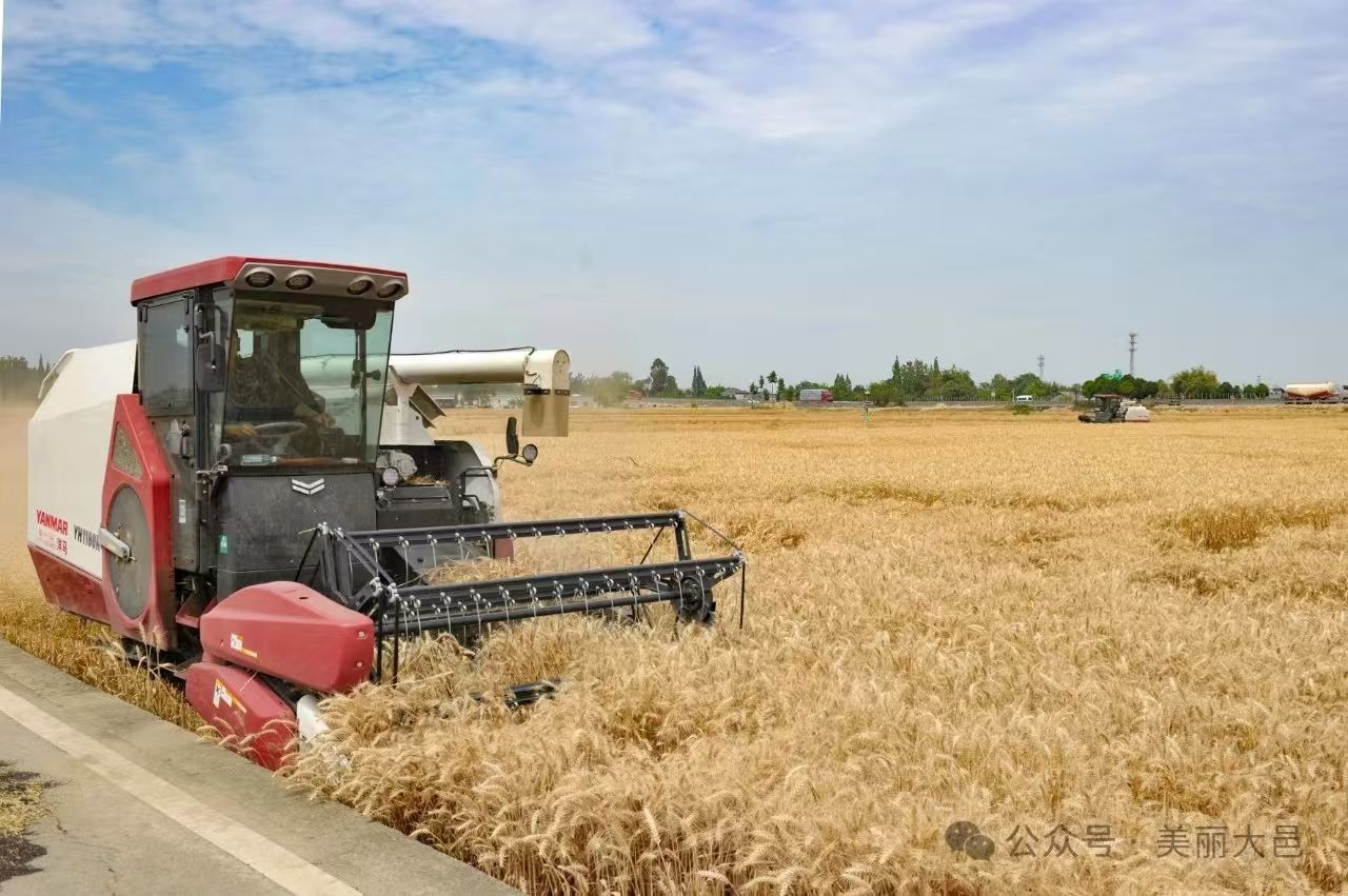 风吹麦浪遍地香,又到一年麦收时。5月15日,成都市大邑县“天府粮仓·百县千片”小麦千亩高产展示片进行现场测产验收。经过机械化实收、称重、测试水分等验收环节后,综合得出,该片田块亩均产量达610.1公斤。作为“天府粮仓”成都片区的核心区域,2025年,大邑全县小麦种植面积继续稳定在14.8万亩,品种以蜀麦1958、蜀麦1963、川麦104、绵麦902等为主,优质、高产、抗逆性强的小麦品种覆盖率达100%。