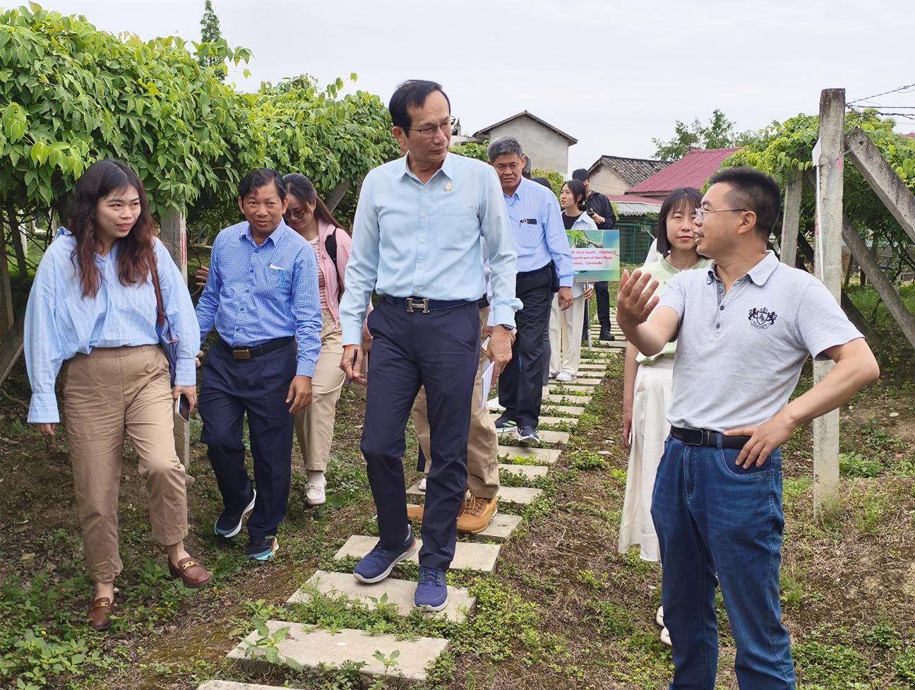 日前,柬埔寨暹粒省卫生厅厅长克罗斯·萨拉(Kros Sarath)率领由8名成员组成的代表团,赴我校农学院三叶木通链产协同创新中心开展考察交流活动。农学院罗培高教授等陪同考察。