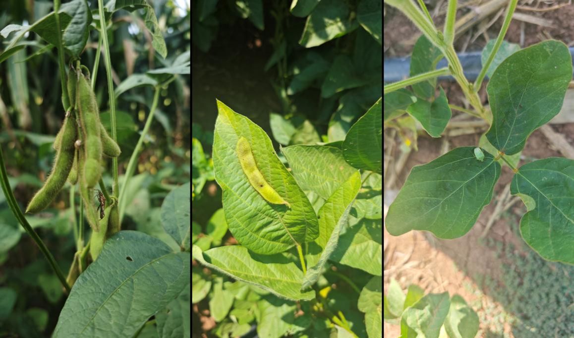 夏大豆根腐病为害后植株枯死,缺苗断垄(左图),大豆病毒病为害导致叶片皱缩或边缘变黄内卷(中图),以及中后期大豆荚腐病(右图)。
