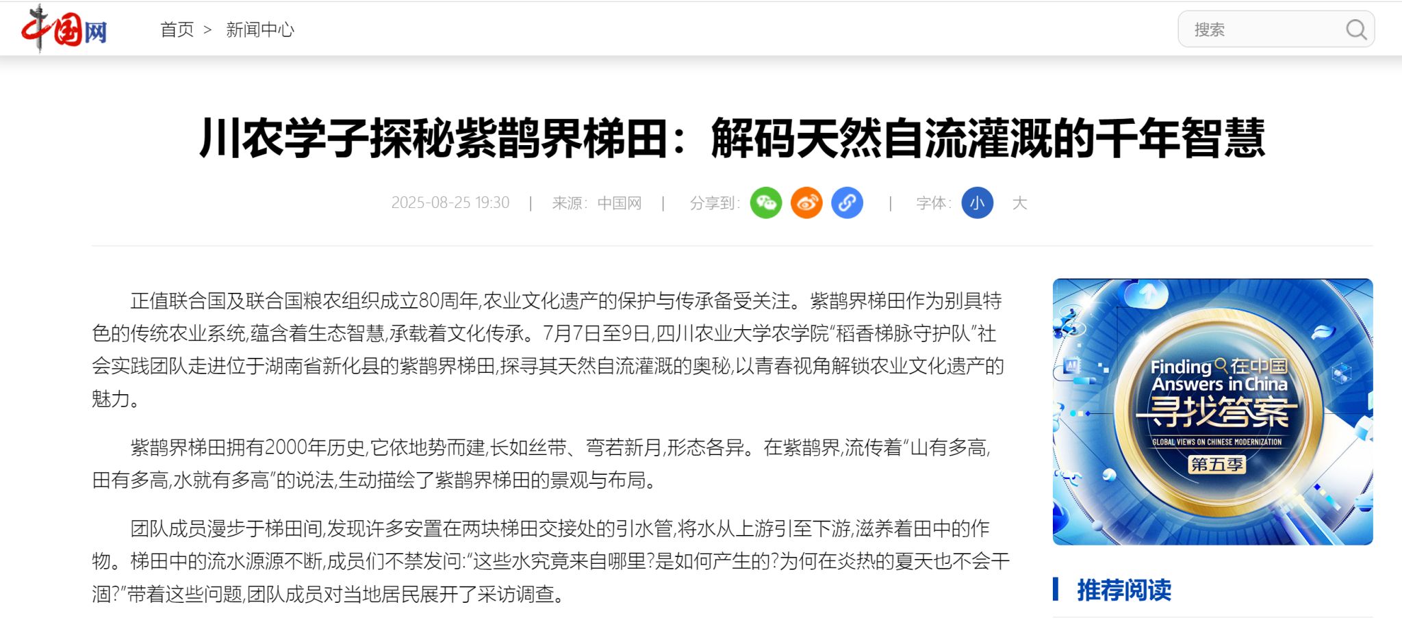 正值联合国及联合国粮农组织成立80周年,农业文化遗产的保护与传承备受关注。紫鹊界梯田作为别具特色的传统农业系统,蕴含着生态智慧,承载着文化传承。7月7日至9日,ok138cn太阳集团529农学院“稻香梯脉守护队”社会实践团队走进位于湖南省新化县的紫鹊界梯田,探寻其天然自流灌溉的奥秘,以青春视角解锁农业文化遗产的魅力。