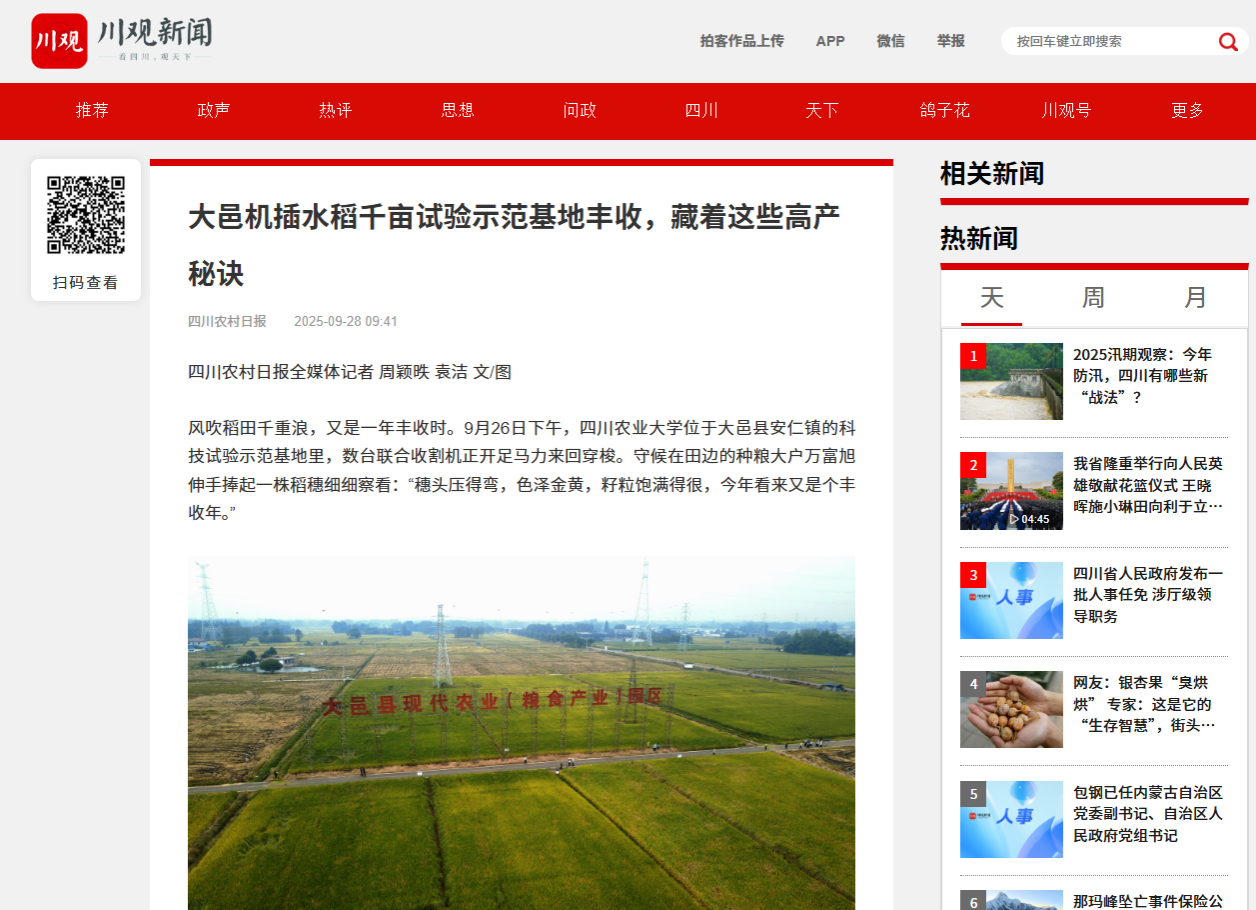 测产现场,四川省农业科学院水稻高粱研究所研究员熊洪作为受邀专家主持验收工作。在随机选取3个示范田块与1个对照田块完成实收、称重、水分测定等规范流程后,熊洪当场宣布:“经过严格测定,百亩攻关田最高亩产824.7公斤,千亩展示片平均亩产771.1公斤!”种粮大户万富旭难掩喜悦,“这个产量确实超出预期!”