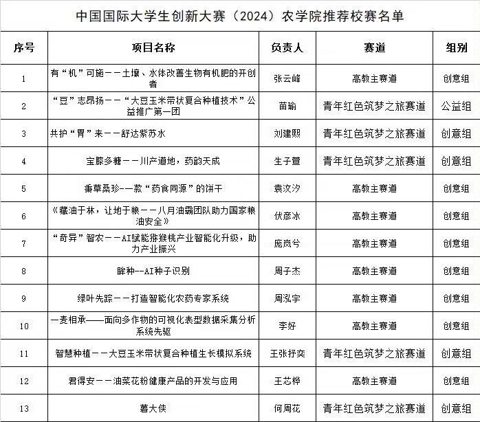 中国国际大学生创新大赛农学院院内预选赛遴选工作已顺利结束,经学院组织答辩评审,现将推荐校赛名单公布如下:
