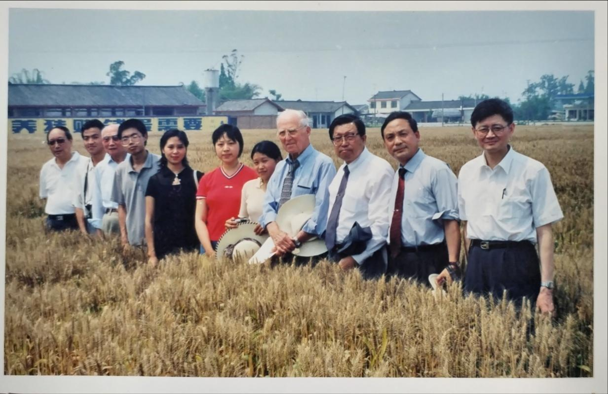 2000年5月13日,诺贝尔和平奖获得者、绿色革命之父及小麦育种家Norman E. Borlang博士(右四)在ok138cn太阳集团529邛崃小麦育种基地访问并指导早播小麦新品种的研究与选育,我校任正隆教授(右二)、罗培高教授(左四)和谭飞泉副教授(左二)。