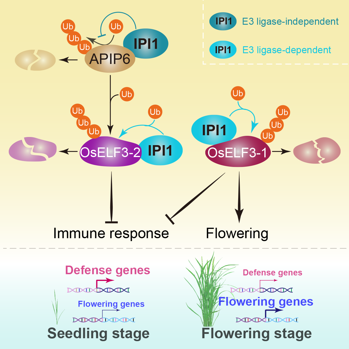 OsELF3-1和OsELF3-2是调控水稻开花和抗病的两个同源蛋白。IPI1是一个含有RING finger结构域的E3泛素连接酶。一方面,IPI1直接与OsELF3-1和OsELF3-2相互作用,促进OsELF3-1/OsELF3-2的泛素化修饰,导致OsELF3-1/OsELF3-2被蛋白酶复合体系统识别并降解。这一过程依赖于IPI1的E3泛素连接酶活性。另一方面,IPI1与另一个泛素连接酶APIP6相互作用,抑制APIP6的自我泛素化,促进APIP6的稳定性,进而促进APIP6下游多个蛋白的泛素化降解,包括OsELF3-2。这一过程不依赖于IPI1的E3泛素连接酶活性。