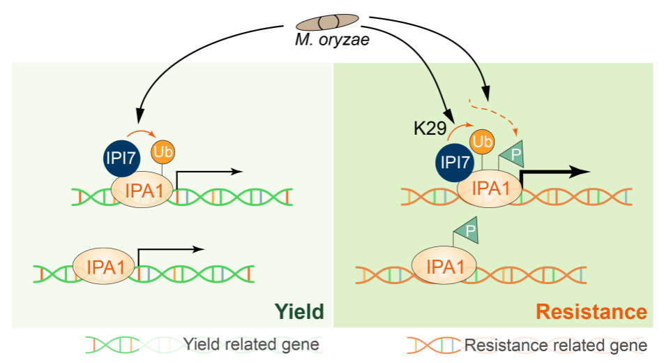 9月1日,西南作物基因资源发掘与利用国家重点实验室/农学院在Nature Communications上发表了题为Fine-tuning of IPA1 transactivation activity by E3 ligase IPI7-mediated non-proteolytic K29-ubiquitination during Magnaporthe oryzae infection的研究论文。该论文揭示了E3泛素连接酶IPI7介导的K29泛素化修饰协同磷酸化控制IPA1的转录激活活性进而实现水稻抗病的分子机制。