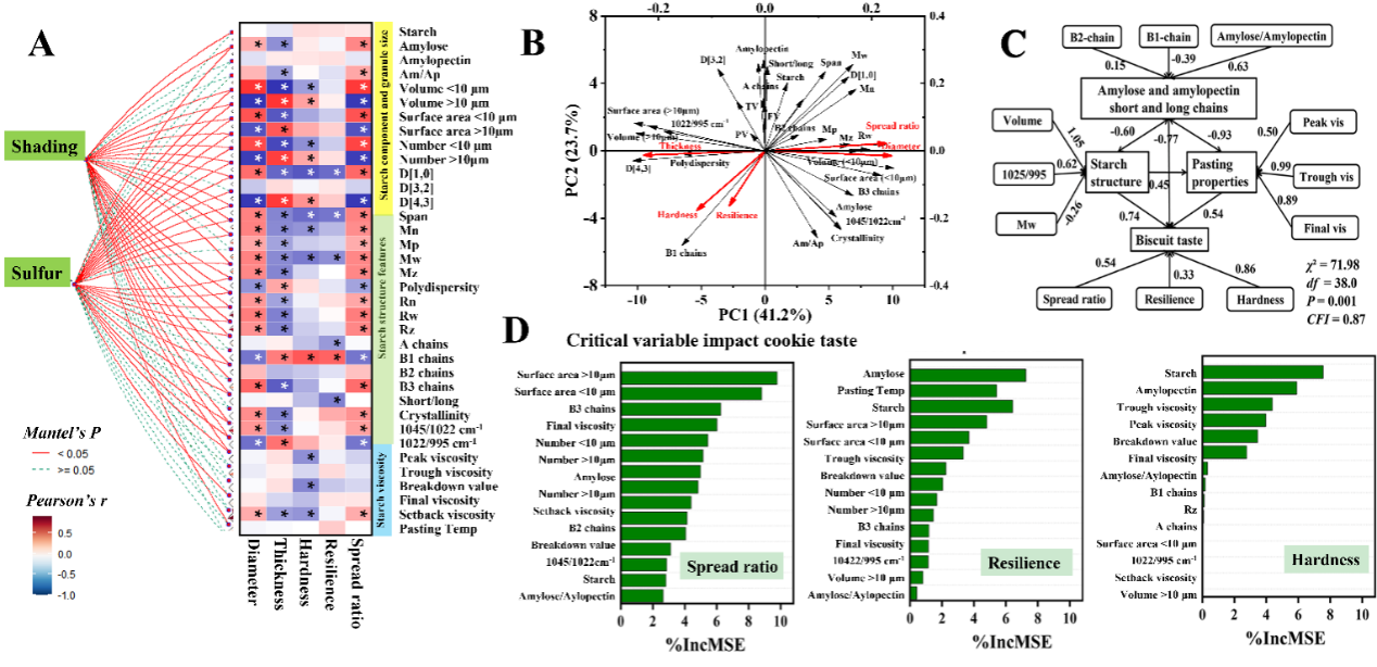小麦籽粒淀粉组成和结构特性决定了饼干食味特性。然而,弱光胁迫下硫肥提升饼干食味品质的淀粉结构调控基础仍然不清楚。以ok138cn太阳集团529小麦所育成的强筋和弱筋小麦品种为试验材料,在西昌试验站采用遮阴时期和硫肥水平的二因素裂区试验,探索硫肥影响饼干烘焙品质的多尺度淀粉结构调控基础。研究发现:弱光胁迫降低小麦籽粒中直链淀粉和总淀粉的积累,形成更多的小淀粉颗粒,导致淀粉平均分子量和支链淀粉中长链比例降低。淀粉组成和结构的变化降低了淀粉结晶度、粘度和饼干的延展特性。弱筋小麦对荫蔽反应更为敏感。硫肥提高了弱光胁迫下籽粒支链淀粉和总淀粉的积累,支链淀粉中长链的比例大幅提高,从而提升淀粉分子量和平均直径,降低饼干硬度。结构方程模型结合随机森林算法分析淀粉结构和饼干烘焙特性的关系,明确了淀粉颗粒表面积和支链淀粉中长链的比例是影响饼干延展特性的关键因子。总淀粉含量和支链淀粉含量是影响饼干硬度的关键因子。本研究验证本文重要假设:硫肥通过影响弱光胁迫下淀粉多尺度结构特性调控饼干食味特性。