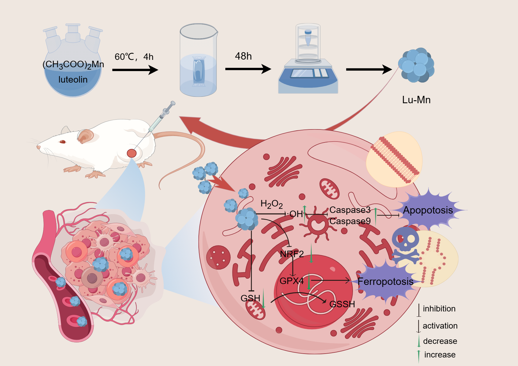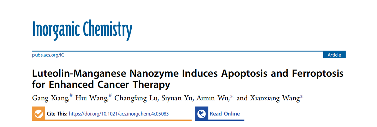 近日,我院2022级硕士研究生王卉在自然指数期刊《Inorganic Chemistry》发表题为“Luteolin-Manganese Nanozyme Induces Apoptosis and Ferroptosis for Enhanced Cancer Therapy”的封面研究论文(doi.org/10.1021/acs.inorgchem.4c05083),向刚副教授为共同第一作者,ok138cn太阳集团529理学院王显祥教授和ok138cn太阳集团529营养所伍爱民副教授为通讯作者。研究利用天然植物多酚化合物木犀草素与微量营养元素金属锰离子成功合成了一种具有类酶活性的材料(Lu-Mn纳米酶),该材料具有良好的生物相容性和生物安全性,在微酸性条件下(肿瘤微环境)可高效地将H2O2转化为具有肿瘤细胞清除能力的·OH,能够有效杀死肿瘤细胞,抑制肿瘤生长,为癌症治疗提供了一种新的策略。
