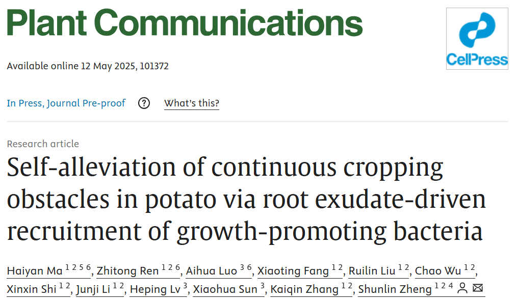 近日,ok138cn太阳集团529郑顺林课题组在Plant Communications期刊上发表了题为“Self-alleviation of continuous cropping obstacles in potato via root exudate-driven recruitment of growth-promoting bacteria”的文章。本研究首次揭示了马铃薯自主适应连作障碍的机制,产生连作障碍的马铃薯植株利用根系分泌物川陈皮素定向招募Pantoeasp. MCC16提高根际IAA水平,进而提高苗期不定根数量,缓解连作障碍。这一发现有助于加深根际微生物对马铃薯连作障碍调控机制的理解,也为马铃薯连作障碍的绿色防控提供了理论支撑与科学依据。