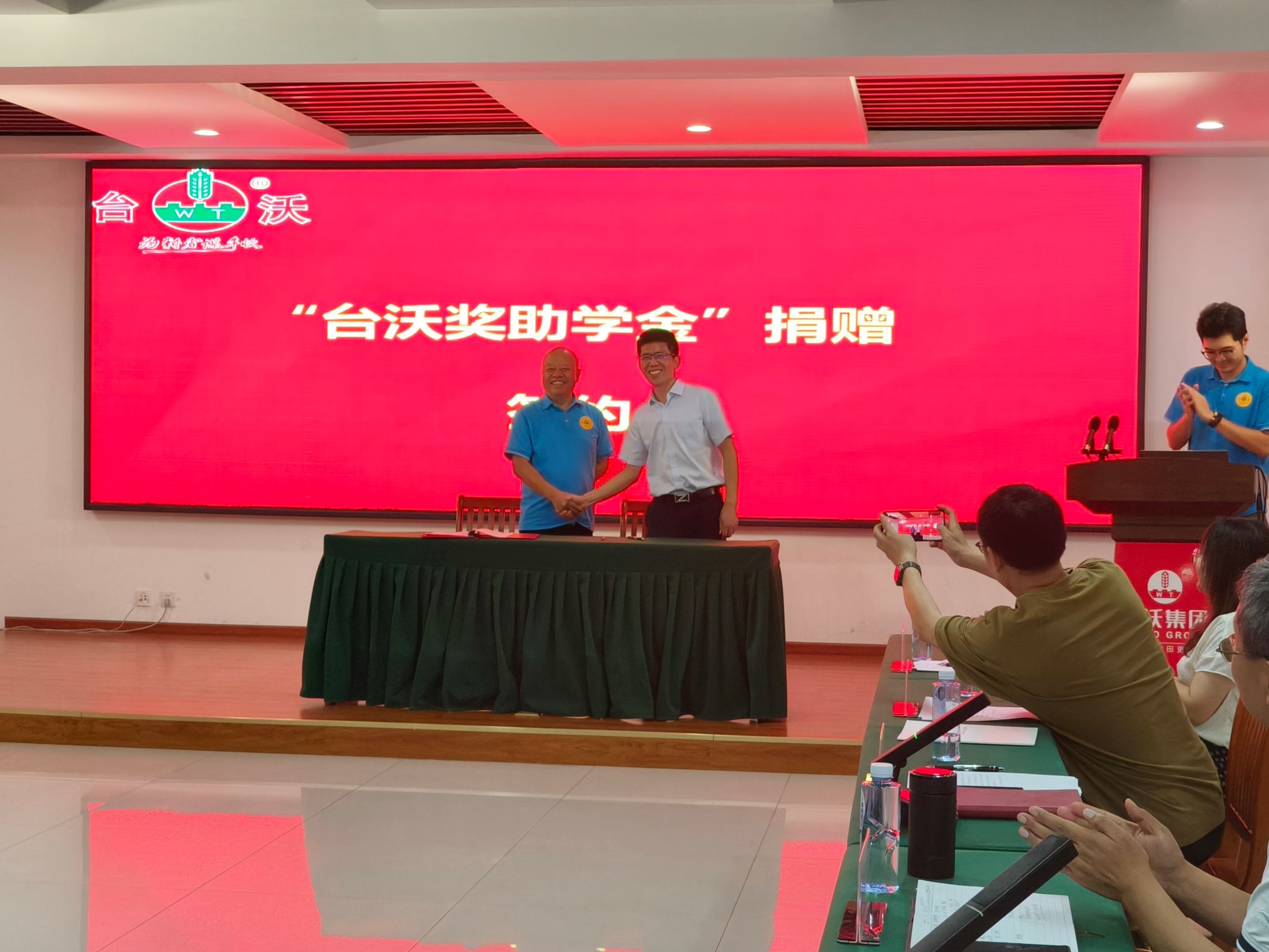 图为唐城书记与台沃集团董事长孙松国签订奖助学金协议