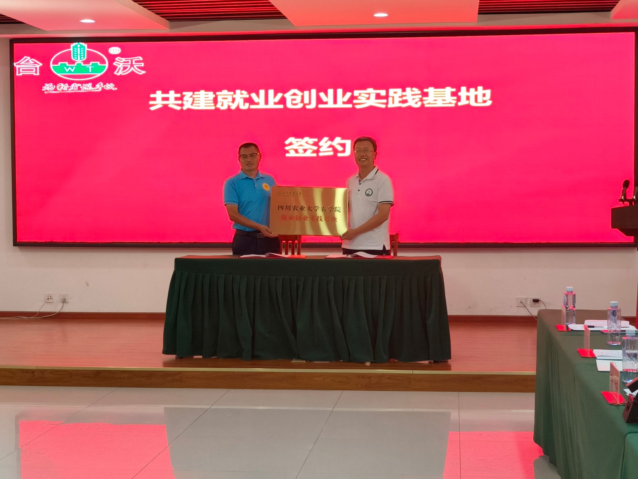 7月4日下午,农学院党委书记唐城、副院长杨峰、行政办主任向刚带队前往位于绵阳市三台县的台沃科技集团股份有限公司,洽谈合作事宜并签订“台沃奖助学金”捐赠协议、党建活动基地共建协议、就业创业实践基地共建协议。台沃科技集团股份有限公司董事长孙松国、党委书记宋玟汛、副总裁曹均成等出席了签约和授牌仪式。
