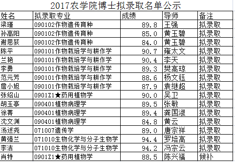 2017年农学院博士录取复试阶段工作已经结束,现将拟录取名单公示如下,如有异议,请到1-507胡剑锋老师处反映情况!