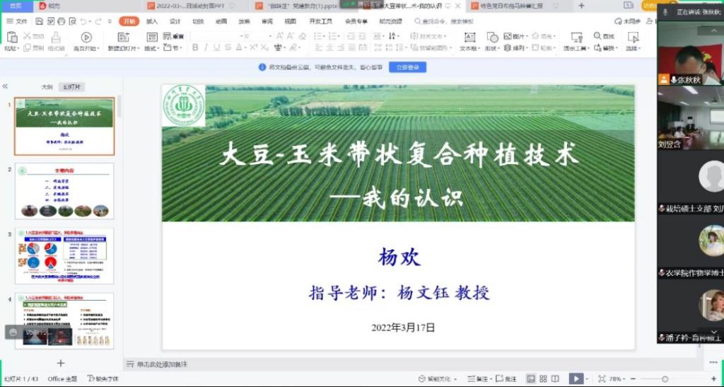 农学院作物学科博士党支部杨欢同志从“玉米-大豆带状复合种植技术”的研究背景、发展历程、关键技术和示范效果四个方面,站在学生的角度,为大家分享了这项由我校杨文钰教授领衔攻关22载,受到国内外广泛推广并两次被写入中央一号文件的历程。“我自硕士阶段进入团队,这是第7年,我们一直致力于振兴我国大豆产业。”大力推广“玉米-大豆带状复合种植技术”是解决玉米不减产,又要提高大豆产能的唯一有效手段,这种模式集种养结合、高效轮作和绿色高效于一体,克服了传统大豆玉米间套作田间配置不合理、难以机械化、生产效率低,经济效益不高等问题,是农业供给侧结构性改革和农业新旧动能转换的新选择,真正实现了良种良法配套、农机农艺结合、生产生态双赢。他表示,未来自己会继续发挥党员先锋模范带头作用,不怕苦不怕累,全力以赴地同团队一起,开展“玉米-大豆带状复合种植技术”的推广和应用,牢记强农兴农使命,助推国家乡村振兴的伟大战略。