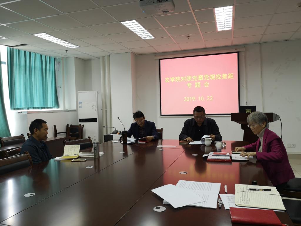 10月22日下午,农学院召开“不忘初心、牢记使命”主题教育党员院领导对照党章党规找差距专题会议。全体院领导参会,学院党委办公室负责同志列席会议。会议由院党委书记胡迅主持。