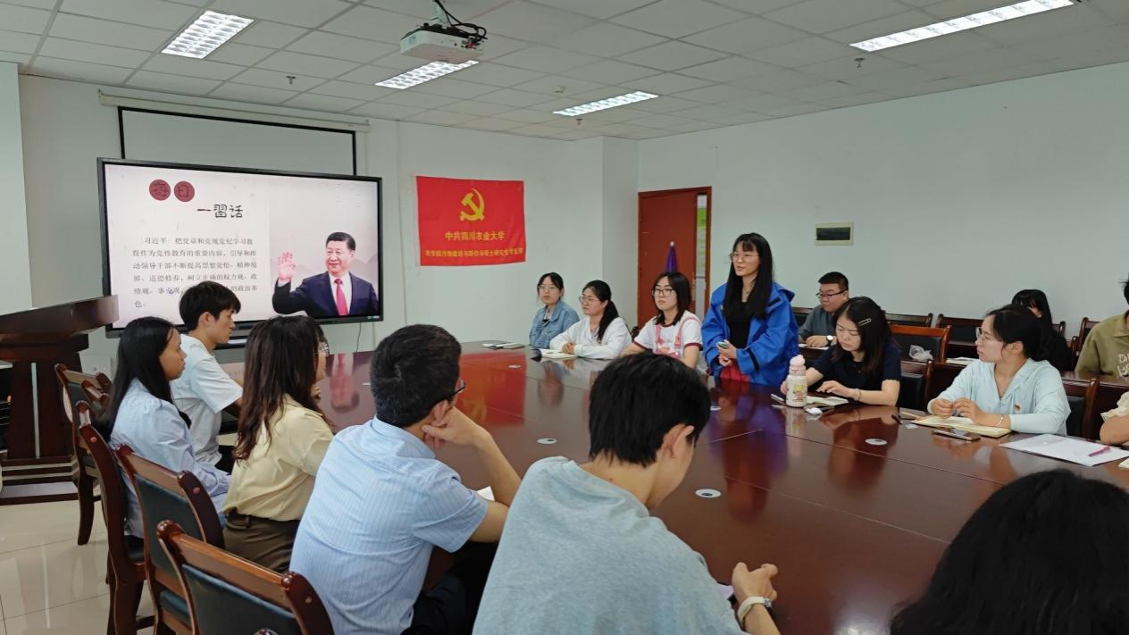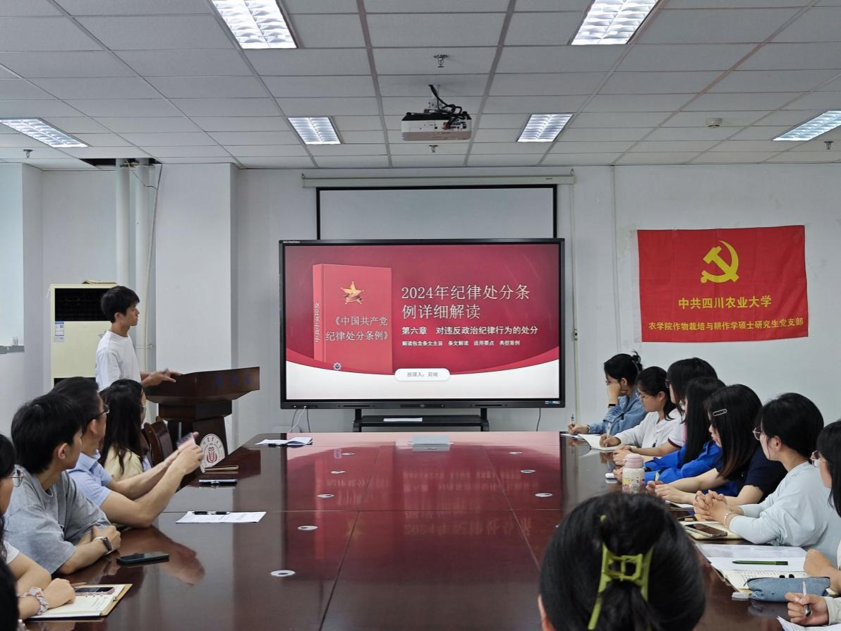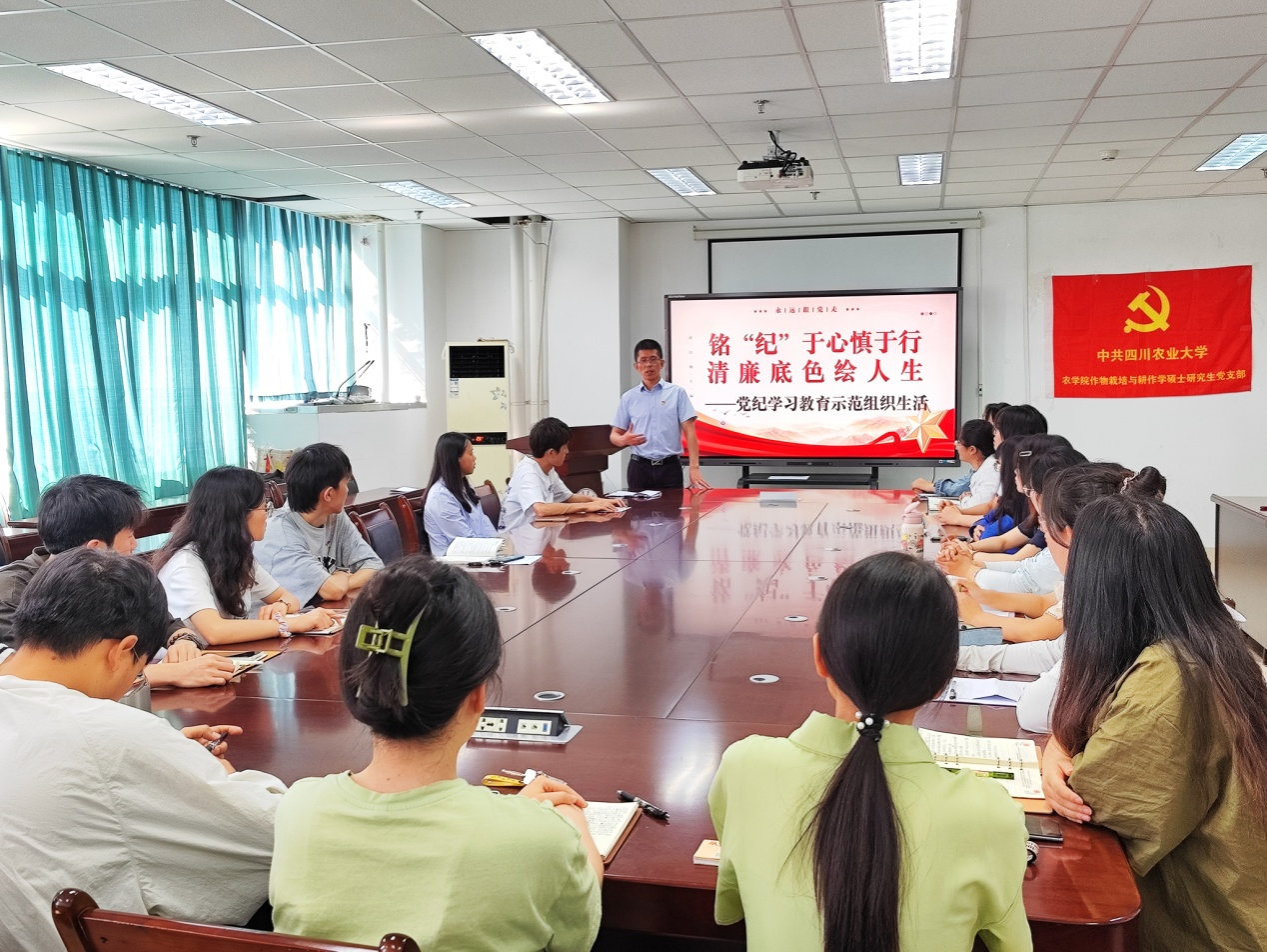 为扎实推进党纪学习教育走深走实,5月30日下午,我校全国高校“百个研究生样板党支部”——农学院作物栽培学与耕作学硕士党支部开展了以“铭‘纪’于心慎于行,清廉底色绘人生”为主题的党纪学习教育专题组织生活。农学院作物学科博士党支部等五个研究生支部观摩学习。